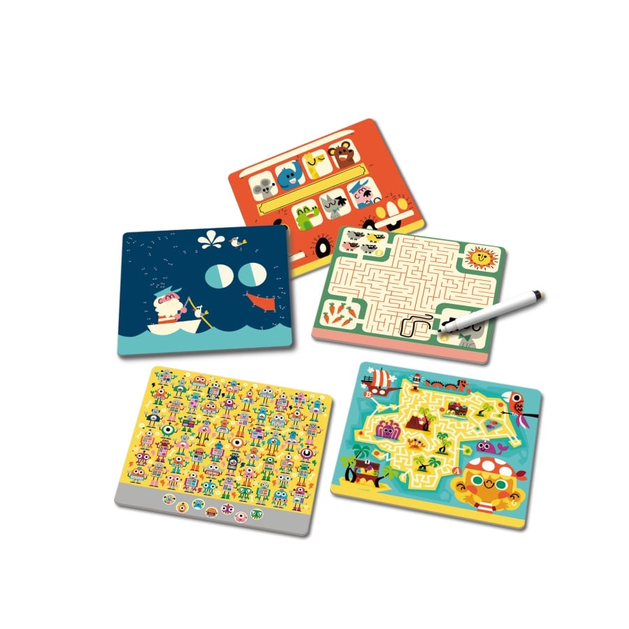 Geh auf Entdeckungsreise und erforsche unterschiedlichste Welten! Auf der Vorderseite der Karten findest du Labyrinthe, Suchbilder und Von-Punkt-zu-Punkt-Rätsel. Die Rückseiten kannst du zu einem großen Suchbild zusammenlegen! Die Karten sind abwischbar, so dass du Rätsel immer wieder neu machen kannst.