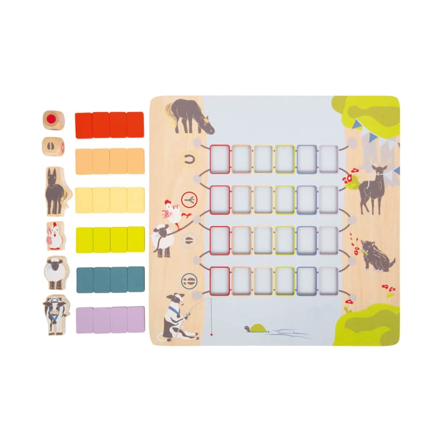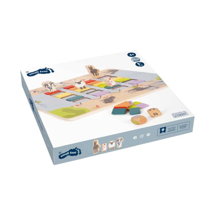 Auf Besuch bei den Waldtieren! „Heinz“ der Hahn, „Fritz“ das Pferd, „Olga“ die Kuh und „Schippi“ das Schaf wollen den Hirsch und das Wildschwein im Wald besuchen. Ziel des Spiels ist es, den Fluss zu überqueren, der den Bauernhof und den Wald trennt! Dazu muss jeder der vier Freunde eine Brücke aus Spielsteinen in bunten Regenbogenfarben bauen. Mit Farb- und Fußabdruckwürfel sowie hochwertigem Spielkarton zur Aufbewahrung. Jedes der Tiere steht für eine Farbe und für seinen speziellen Fußabdruck – so kann jedes Tier seinem Startfeld zugeordnet werden. Neben dem Spielspaß lernen Kinder auf diese Art und Weise ganz nebenei, welches Tier welchen Fußabdruck hat. Das Spiel kann in drei Spielvarianten gespielt werden, die auch ohne Zählen funktionieren und somit auch für jüngere Mitspieler geeignet sind. Vertiefungen im Spielfeld stellen sicher, dass die Brückenspielsteine sicher liegen und nicht verrutschen.