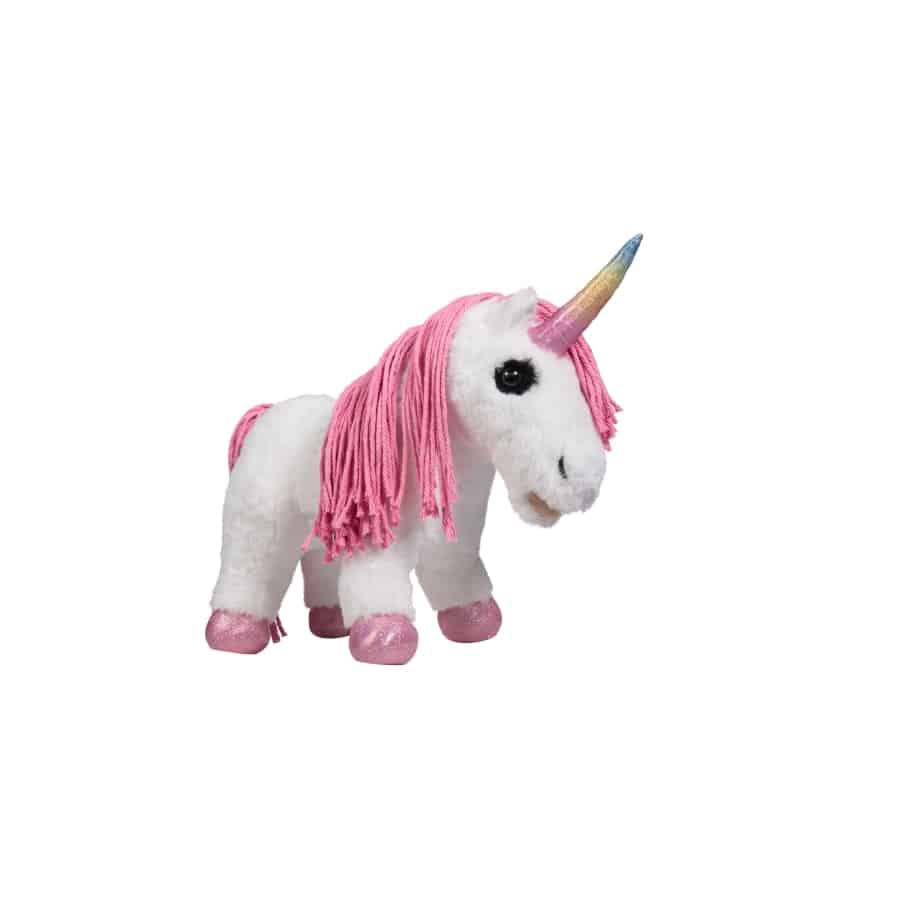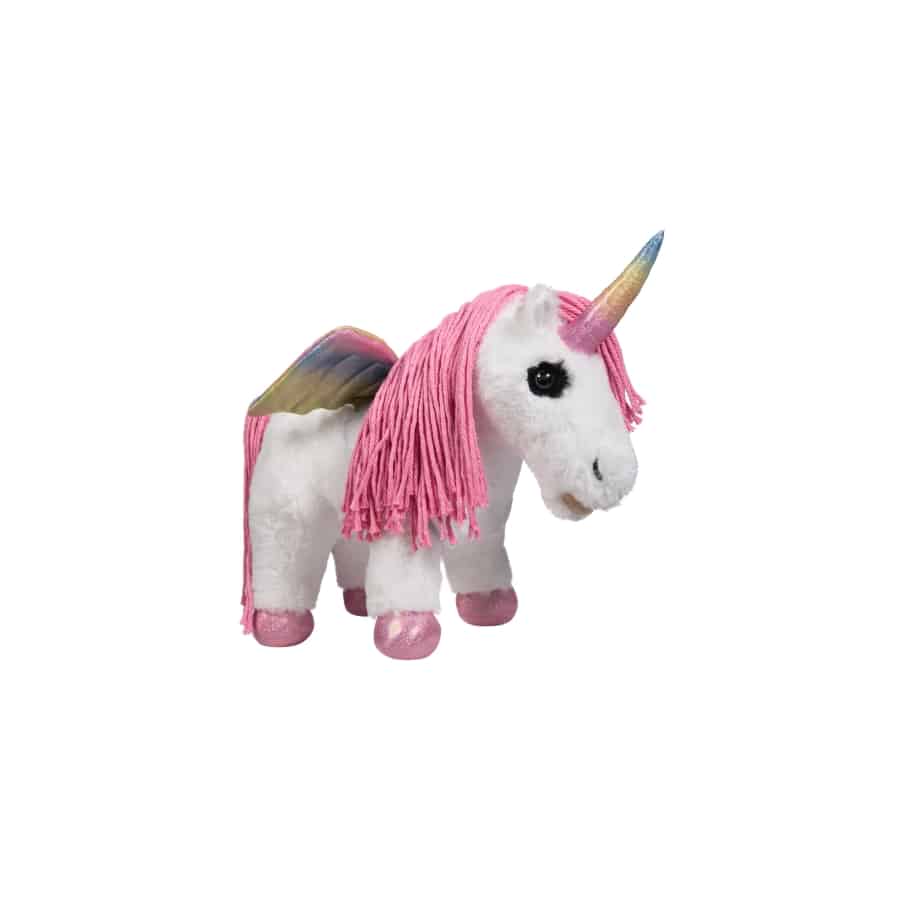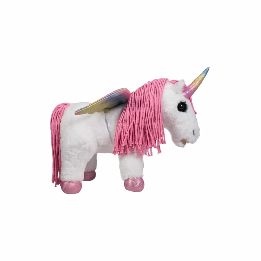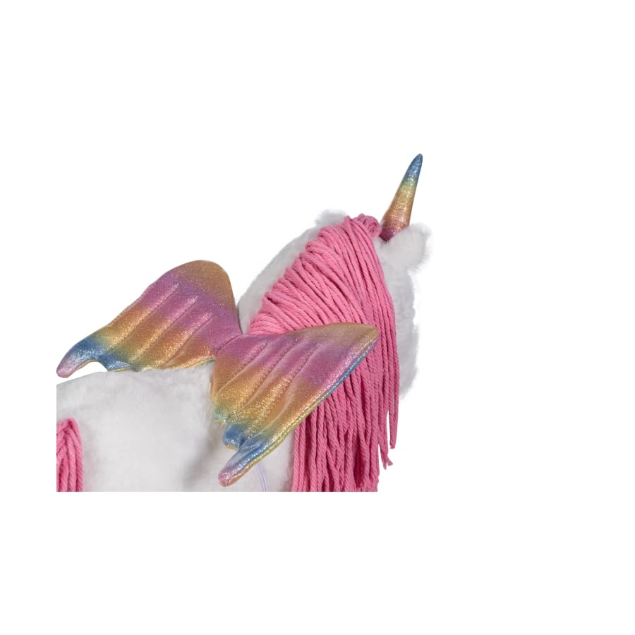 Die Einhorn-Variante des beliebten Cuddle Ponys präsentiert sich mit schimmernden Horn und Flügeln im pastelligen Farbverlauf. Auch die rosafarbenen Hufe des weißen Einhorns glitzern, und Mähne und Schweif sind lang und rosa, und perfekt zum Frisieren und Flechten. Währenddessen ist das Fell des Einhorns schön weich, sodass es sich wunderbar zum Kuscheln eignet. Doch das Einhorn ist nicht nur zum Knuddeln und als treuer Freund geeignet. Es lässt sich darüber hinaus pflegen und ausstatten wie ein lebendes Pony. Die pastellfarbenen Flügel sind abnehmbar, sodass Kinder anschließend das Satteln üben können. Auch das Trensen und sogar Bandagieren lässt sich am Einhorn spielerisch erlernen. Das Plüscheinhorn steht dabei stabil auf allen vier Hufen. Das Maul ist mit einem kleinen Magneten ausgestattet, sodass das Gebiss der separat erhältlichen Trense gut darin liegt. Geliefert wird das Spieleinhorn in einer Verpackung im Look eines authentischen Pferdeanhängers. Der Pferdeanhänger aus Pappe lässt sich per Klettverschluss öffnen und oben kann ein Trageband angebracht werden. Mit diesem Gesamtpaket sorgt das Cuddle Pony Unicorn für ein großartiges Spielvergnügen.