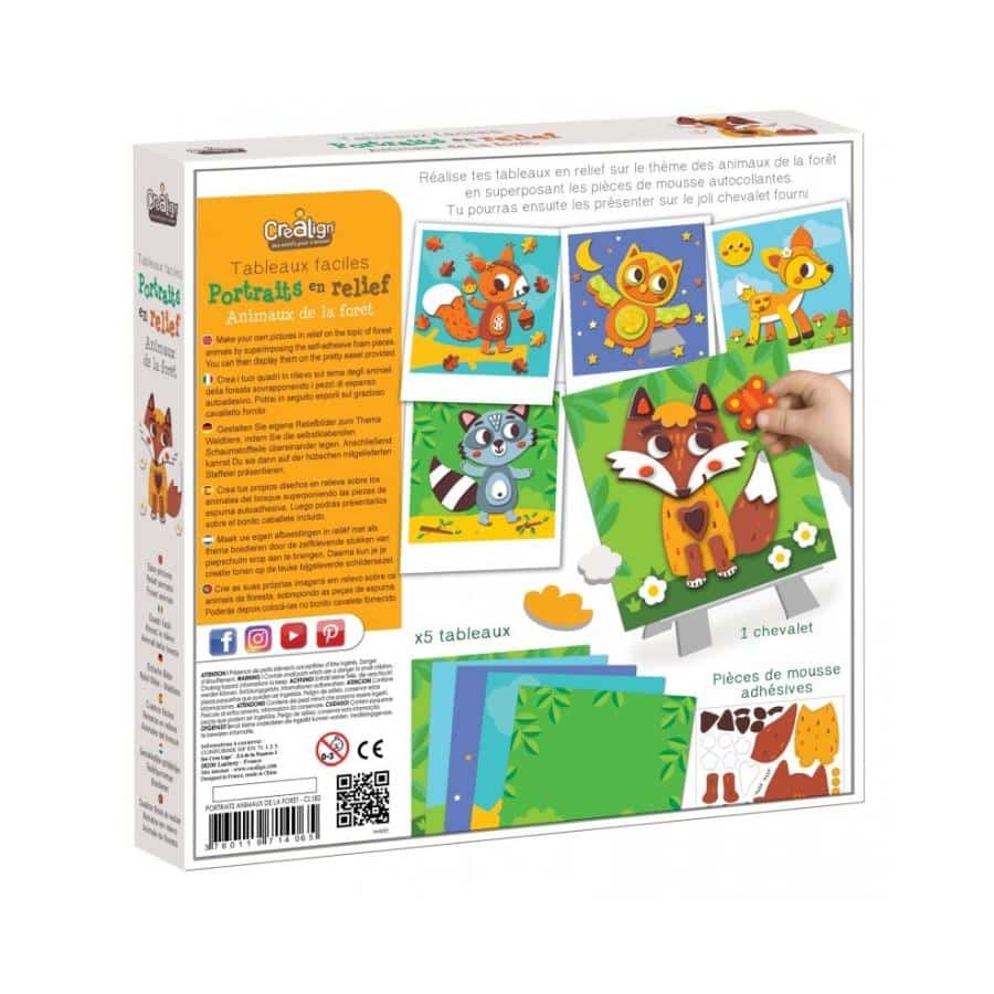 Zum Zusammenbauen und Beleben der Tiere dank der dicken und selbstklebenden vorgeschnittenen Schaumstoffstücke. Kinder können ihre Lieblingstiere nachbauen und ihre Werke dann auf der bereitgestellten Staffelei ausstellen.