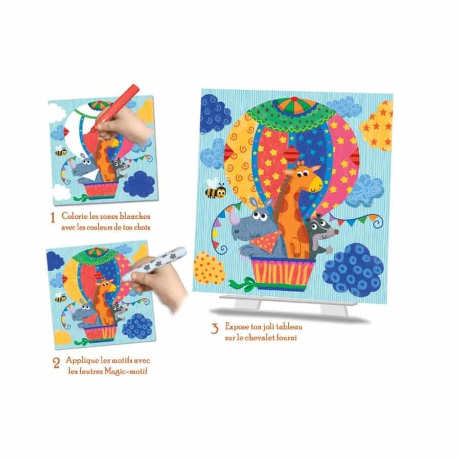 Färben Sie Ihre Lieblingsfiguren mit magischen Markern. Mit den „Magic Pattern“-Stiften können Sie Ihre Farben personalisieren, indem Sie Muster drucken. Die Kinder müssen die Karten vervollständigen, indem sie sie ausmalen. Dann tragen sie die Muster ihrer Wahl auf, die dank der magischen Tinte erscheinen.