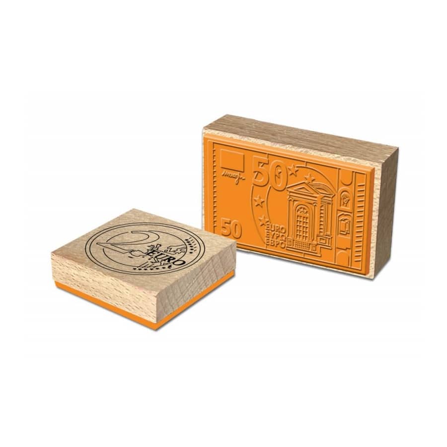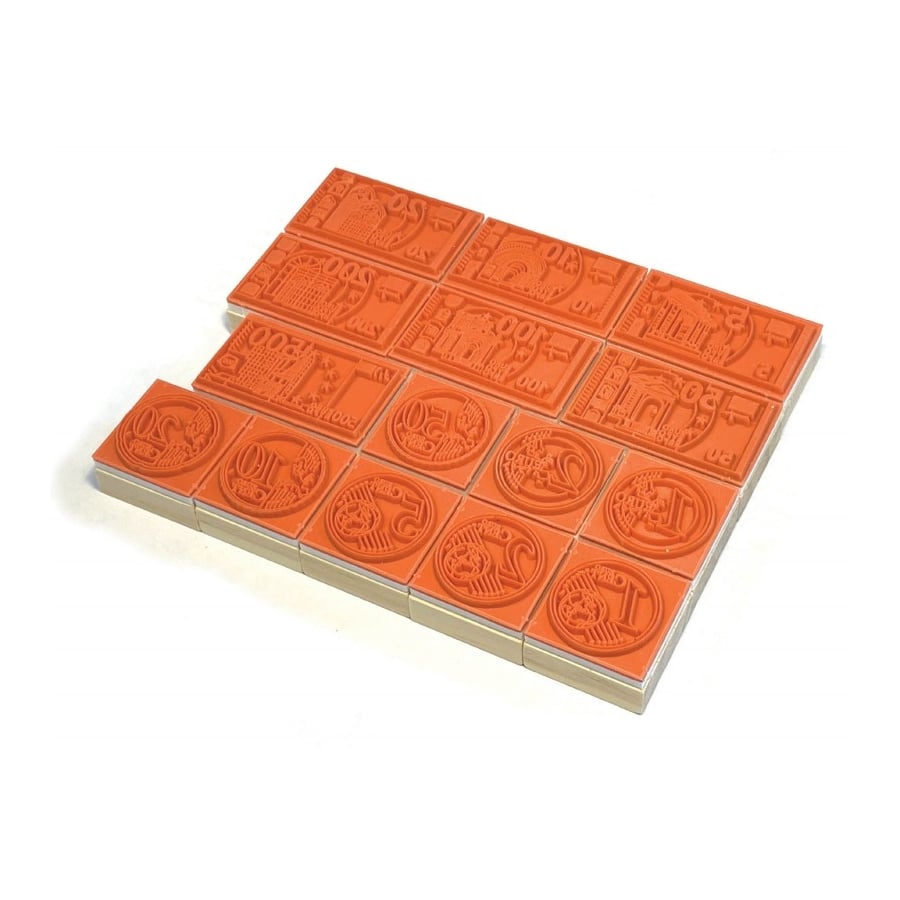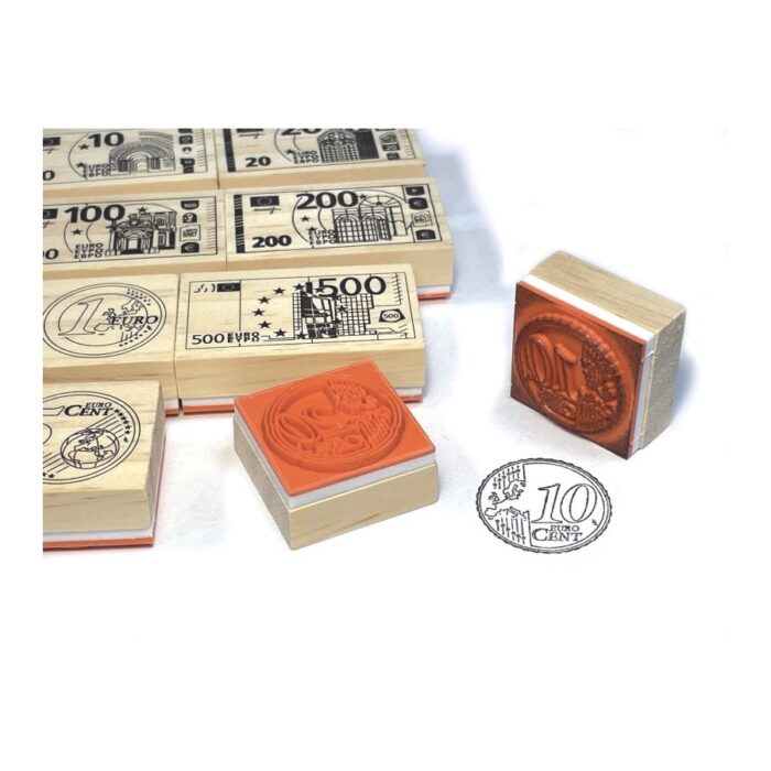 Ein Set mit lustigen Stempeln, die Geldscheine und Münzen darstellen, um das Zählen und Rechnen zu lernen.