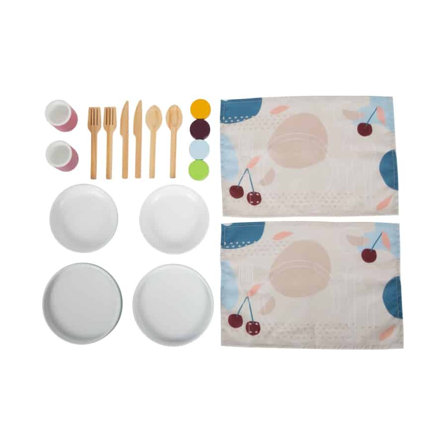 Das moderne Küchen-Spielset bietet mit tiefen und flachen Tellern, Bechern und robustem Vollholzbesteck genau das, was Kinder für stundenlanges Spielen in der Kinderküche benötigen! Verschiedenfarbige Holzscheiben symbolisieren unterschiedliche Getränke. Zusätzlicher Lerneffekt: Das Spielgeschirr-Set umfasst liebevoll bedruckte Platz-/Tischsets, mit denen schon die Kleinsten lernen, wie der Tisch richtig gedeckt wird. Durch die erfrischende Farbkombination aus einem skandinavischen Rauchblau und einem fruchtigen Beeren-Rot harmoniert das Geschirr-Set perfekt mit der Kinderküche kompakt „tasty“ und erweitert die Küchenzubehör-Artikel der Produktlinie „tasty“ ideal. Das auf Langlebigkeit ausgelegte strapazierfähige und robuste Geschirr unterstützt Kinder spielerisch bei der Entwicklung von Feinmotorik, Hand-Augen-Koordination und regt zu sozialer Interaktion an.