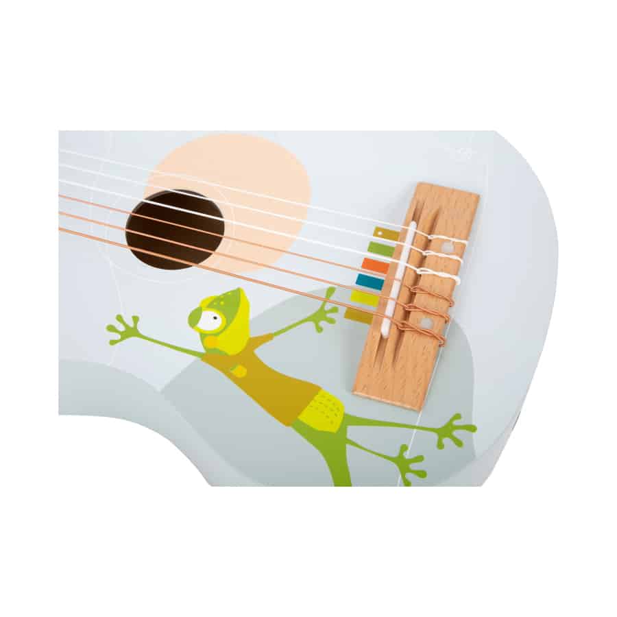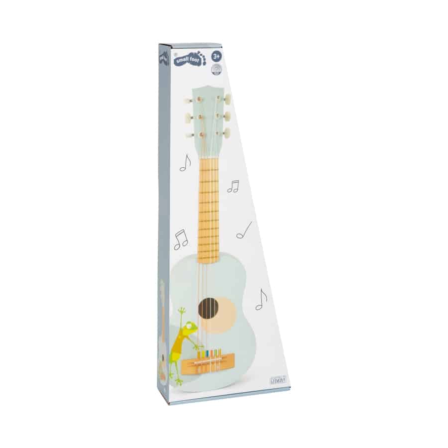 Gerd Gecko spielt Gitarre! Diese besonders leichte Akustikgitarre in kindgerechter Größe überzeugt durch ihr fröhliches Design und der Kombination aus naturbelassenem Holz mit modernen Blautönen! Highlight: Die entsprechend der Tonleiter farbmarkierten Saiten unterstützen kleine Musiker ideal bei ersten Liedern! Inkl. Notenblatt und zwei Plektren für große und kleine Hände. Der absolute Hit für kleine Gitarristen! Diese Kinder-Gitarre fördert erstes Verständnis für Töne, trainiert die akustische Wahrnehmung sowie Fingerfertigkeit und schult Rhythmus- und Taktgefühl.