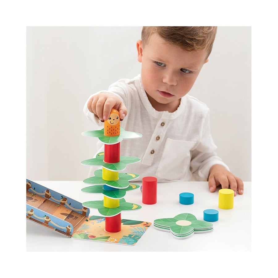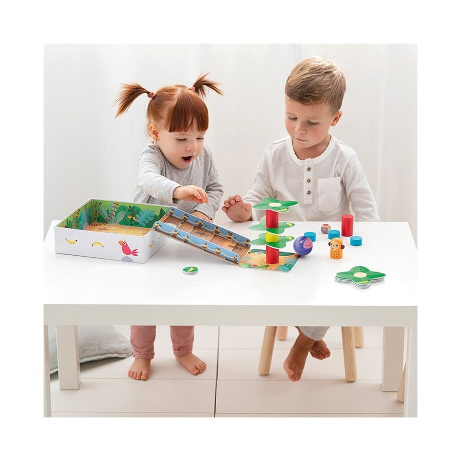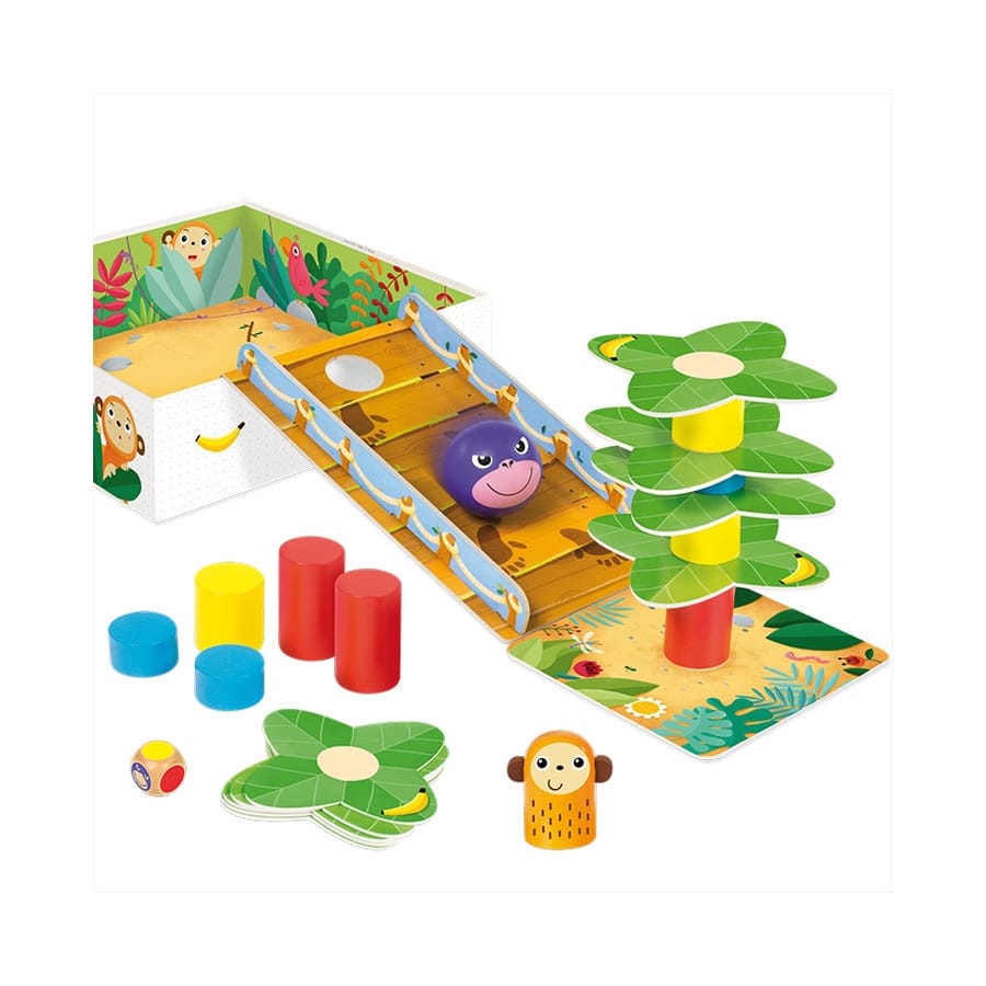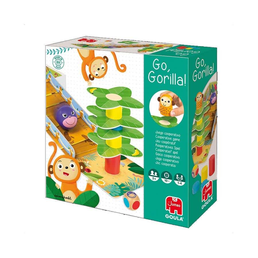 Go, Gorilla! von GOULA – Baue eine Palme auf und setze den Affen drauf, ohne dass er herunterfällt. Doch Vorsicht vor dem Gorilla! Inhalt: 11 Holzteile, 9 Blätter, 1 Würfel, 4 Bananenplättchen, Spielunterlage und Rampe