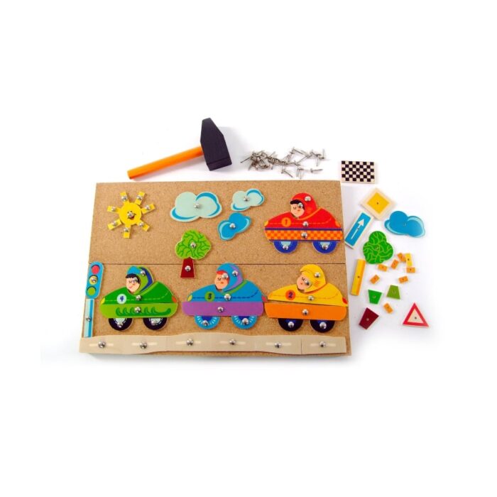 Mit diesem Hammerspiel gibt´s keine Langeweile mehr. Die bunte bedruckten Farbtäfelchen und verschiedenen Formen regen die Fantasie ihres Kindes an und dabei schult es seine Feinmotorik. Auf der Korkplatte entstehen immer wieder neue Bilder. Das Hammerspiel bringt jede Menge Abwechslung beim Gestalten von Bildern und beschäftigt Kinder lange und immer wieder.
