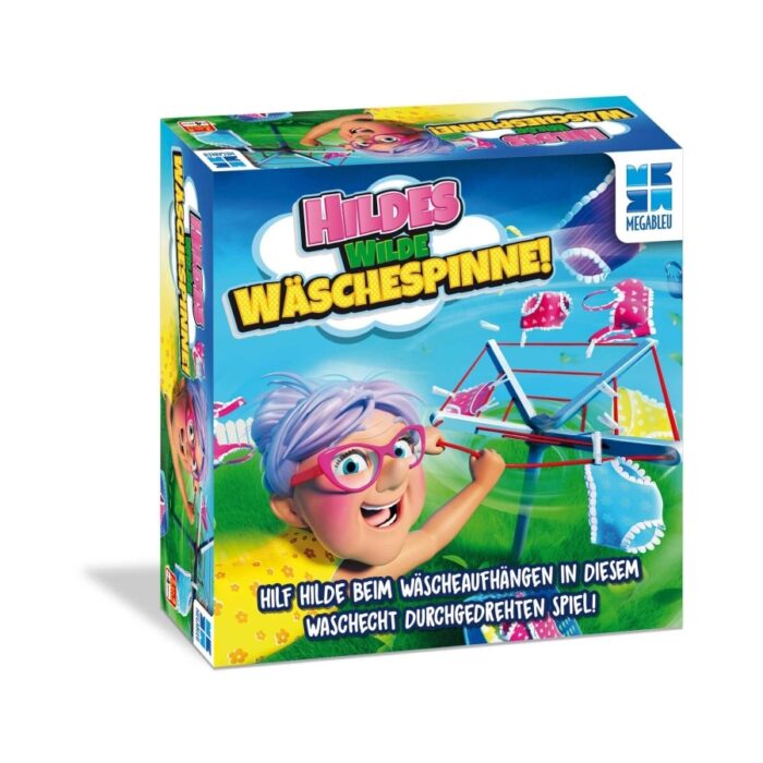 Kannst du Hilde beim Wäscheaufhängen helfen? Eigentlich kein Problem, aber Achtung: Heute ist es ziemlich windig draußen und das mach da Spiel zur kurzweiligen Herausforderung für Kinder! Werft den Wetterwürfel: Bei Sonnenschein habt ihr Glück und könnt ein Wäschestück aufhängen, aber wenn es stürmt, müsst ihr den Knopf drücken und die Wäschespinne beginnt, sich zu drehen. Hilde kann sihc gerade noch festhalten, aber wessen Kleider von der Leine fallen, der muss wieder von vorne mit Aufhängen anfangen! Wer zuerst alle Kleider in seiner Farbe aufgehängt hat, der gewinnt.