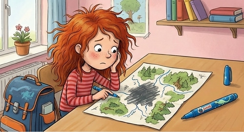 Laura nahm ihre Karte. „Schau.“ Sie zeigte Sarah den grauen Fleck. Anstatt die Radierkappe zu benutzen, nahm Laura die Schreibspitze. Mit fester Hand begann sie, direkt in die graue Wolke auf dem Papier zu zeichnen. Sie malte blaue Linien, die sich um das Grau wickelten.