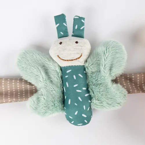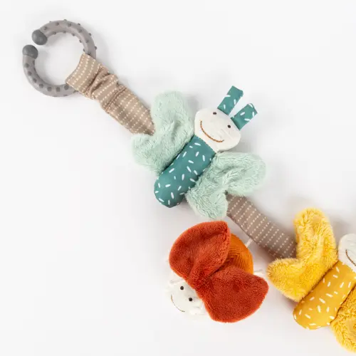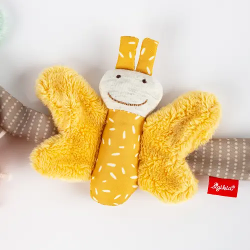 sigikid yellow – the sunshine collection – steht für eine moderne und harmonische Farbzusammenstellung. Die Kollektion ist typisch sigikid: positiv und voller Lebensfreude! Die Wagenkette Schmetterling bietet gute Unterhaltung für das Baby im Kinderwagen. Die farbenfrohe Wagenkette mit zwei Schmetterlingen und einem Käfer bietet dem Baby unterwegs viel Freude und Abwechslung. Die Kette kann mittels zwei C-Ringen am Kinderwagen, der Babyschale oder auch zu Hause am Bettchen flexibel befestigt werden. Eine integrierte Rassel weckt die Neugier Ihres kleinen Lieblings. Wenn die Kette dem Baby unter Aufsicht zur Erkundung in die Hand gegeben wird, kann es die weichen Tiere ertasten. Die unterschiedlichen Materialien sorgen für haptische Abwechslung. Die bunten Farben und die freundlichen Gesichter der Tiere sprechen das Kind optisch an. Wie bei sigikid gewohnt, sind alle Stoffe hochwertig verarbeitet und halten auch häufiger Wäsche bei 30 °C im Schonwaschgang der Waschmaschine stand. Die Kinderwagenkette ist für Babys ab Geburt bis 12 Monaten geeignet. Achtung! Um mögliche Verletzungen durch Verheddern zu verhindern, ist dieses Spielzeug zu entfernen, wenn das Kind beginnt, auf allen vieren zu krabbeln. sigikid legt besonderen Wert auf ausgesuchte Materialien und durchdachtes Design. Um die Sicherheit unserer Produkte zu gewährleisten, werden von akkreditierten Prüfinstituten regelmäßig Prüfungen gemäß dem aktuell geltenden (europäischen) Recht durchgeführt. Die Marke sigikid steht für kuschelige Produkte, die Emotionen wecken und ein gutes Gefühl vermitteln, sowohl bei den Eltern als auch bei ihren Kindern. Seit 55 Jahren folgt sigikid einem klaren Leitsatz: FIRST CLASS FOR KIDS! Wir machen die Welt von Familien von Anfang an kuscheliger und bunter.