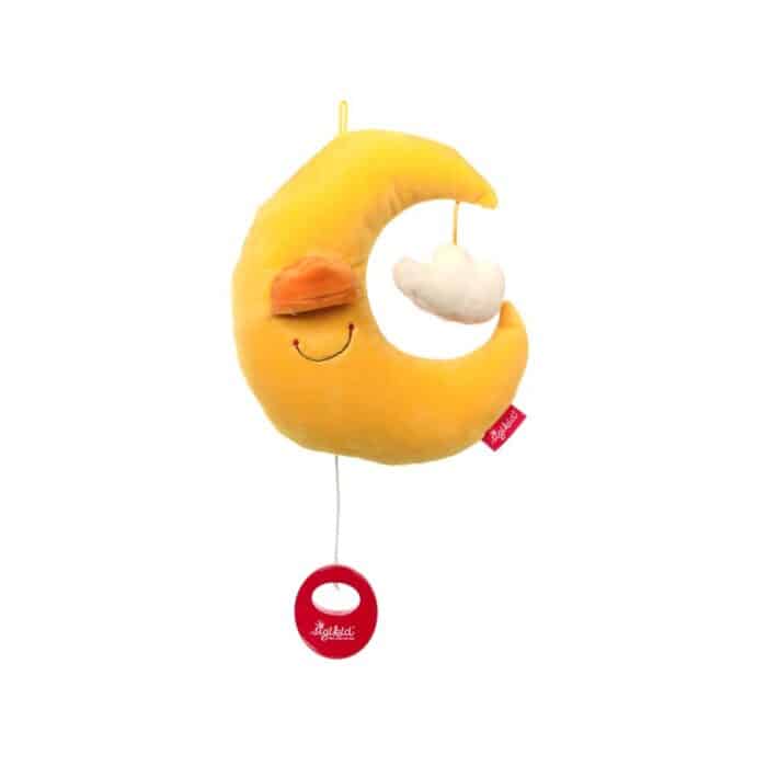 Der Mond ist aufgegangen! Sanft baumelt der etwa 21 cm große Mond mit der kleinen Wolke über dem Babybettchen und schaut mit freundlichen großen Augen auf den kleinen Erdenbürger. Anhand der Mimikfalte können seine Augen geschlossen und geöffnet werden. Mit einer sanften Schlafmelodie sorgt die Mond-Spieluhr für ein beruhigendes Einschlafritual und begleitet das Baby in den Traum. Die Spieluhr wird mit einer von fünf Schlafmelodien, die zufällig ausgewählt ist, ausgeliefert. Für Fragen zu speziellen Melodien-Wünschen wenden Sie sich bitte an den Hersteller. Die weichen Materialien bieten eine angenehme Haptik. Darüber hinaus ist die Spieluhr weich mit hygienischer Polyesterwatte gefüllt und eignet sich daher auch prima zum Kuscheln und Schmusen. Alle Werkstoffe sind hochwertig verarbeitet und halten auch häufiger Wäsche bei 30° im Schonwaschgang stand. Das Spielwerk nimmt man zum Waschen heraus – einfach den Sicherheitsreißverschluss mit einer Büroklammer (siehe Anleitung) öffnen. Die Spieluhr ist von Anfang an für das Baby geeignet und wird oftmals bereits vor der Geburt auf Mamas Bauch gelegt. Schlaf gut, kleiner Liebling! sigikid legt besonderen Wert auf ausgesuchte Materialien und durchdachtes Design. Durch akkreditierte Prüfinstitute finden in der Produktentwicklung und Produktion ständig Prüfungen gemäß der Spielzeugrichtlinie 2009/48/EG statt. Die Marke sigikid steht für kuschelige Produkte, die Emotionen wecken und Eltern und Kindern gleichermaßen ein gutes Gefühl vermitteln. Seit über 50 Jahren folgt sigikid einem klaren Leitsatz: FIRST CLASS FOR KIDS! Wir machen die Welt für Familien von Anfang an kuscheliger und bunter.