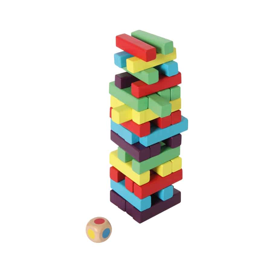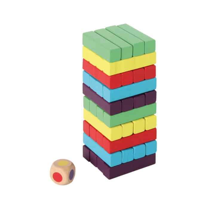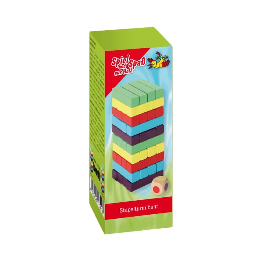 Geschicklichkeitsspiel mit 40 bunten Holzstäben und neuer Würfel-Variante. Der Turm wird in Lagen von je vier Stäbchen, abwechselnd längs- und quer ausgerichtet, aufgebaut. Reihum ziehen nun die Mitspieler ein Stäbchen aus dem Turm und setzen es vorsichtig in der vorgegebenen Richtung auf den Stapel. Sieger ist, wer als letztes ein Stäbchen auf den Turm setzen kann, ohne dass er einstürzt. Spielvariante mit Farbwürfel: Mit dem Farbwürfel wird jeweils bestimmt, welche Farbe der Spieler ziehen darf.