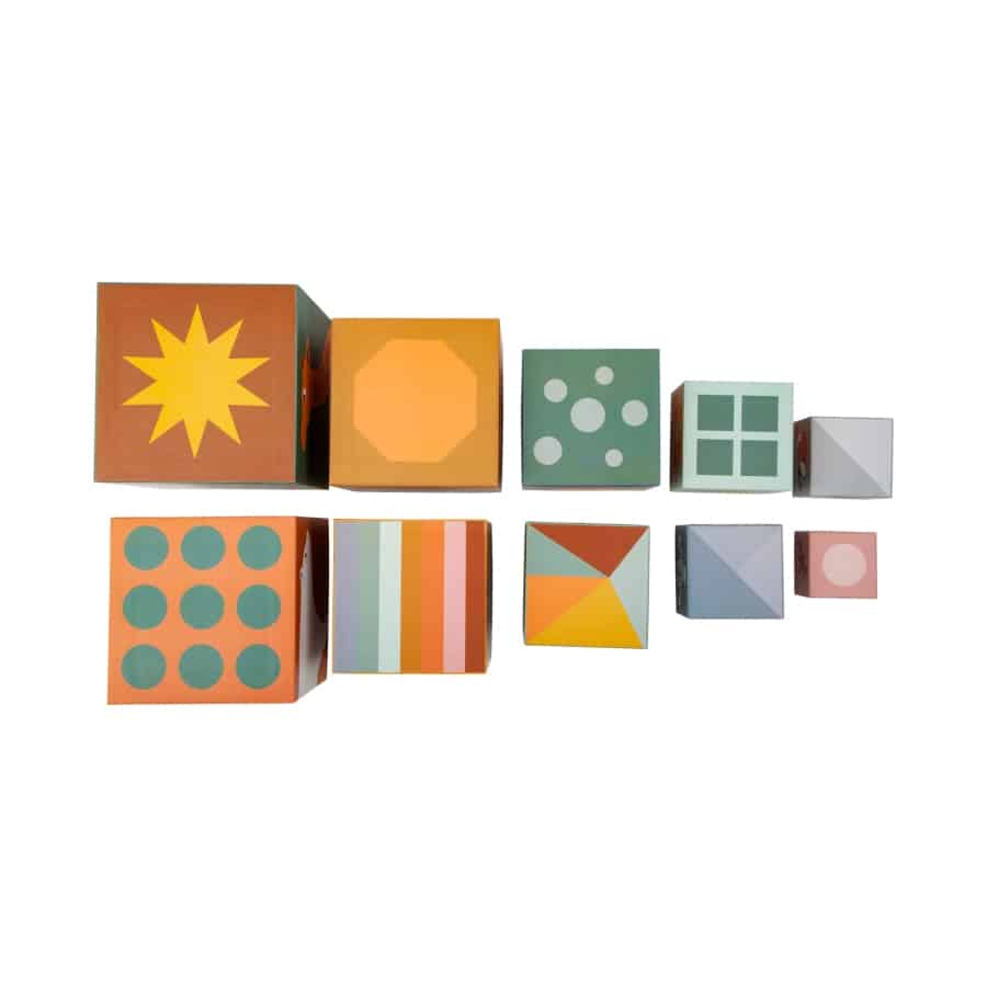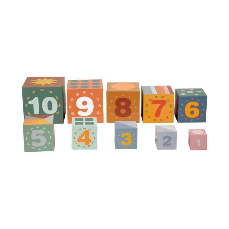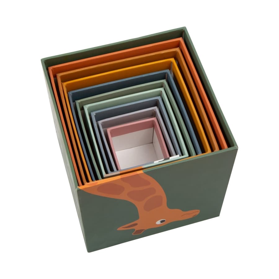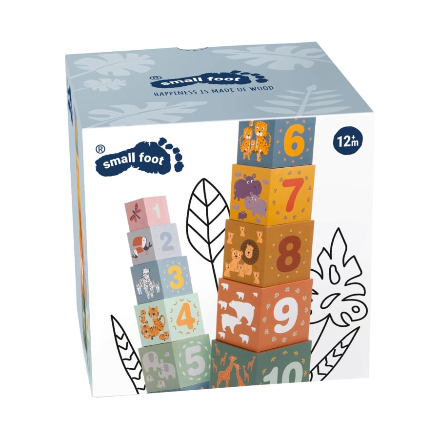Tierischer Stapel-Spaß! Mit diesen zehn Stapelwürfeln in modernem, kindgerechtem Safari-Look können kleine Baumeister ihre Stapel-Künste unter Beweis stellen. Die Stapelwürfel aus stabiler Pappe sind mit niedlichen Motiven aus der Tierwelt sowie mit den Zahlen von 1-10 versehen. Die Anzahl der abgebildeten Tiere auf einem Würfel entspricht dabei der Zahl auf der Würfelrückseite. So entwickeln Kinder spielerisch ein erstes Zahlenverständnis und lernen verschiedene Tiere kennen. Wer bringt die Würfel in die richtige Reihenfolge? Beim Sortieren und Stapeln der Safari-Würfel trainieren die Kleinen Motorik, Konzentration und Geschicklichkeit, während sie gleichzeitig ein Verständnis für Farben und Größen entwickeln. Nach dem Spielen lassen sich die Würfel ganz einfach ineinander stecken und platzsparend im größten Würfel verstauen.
