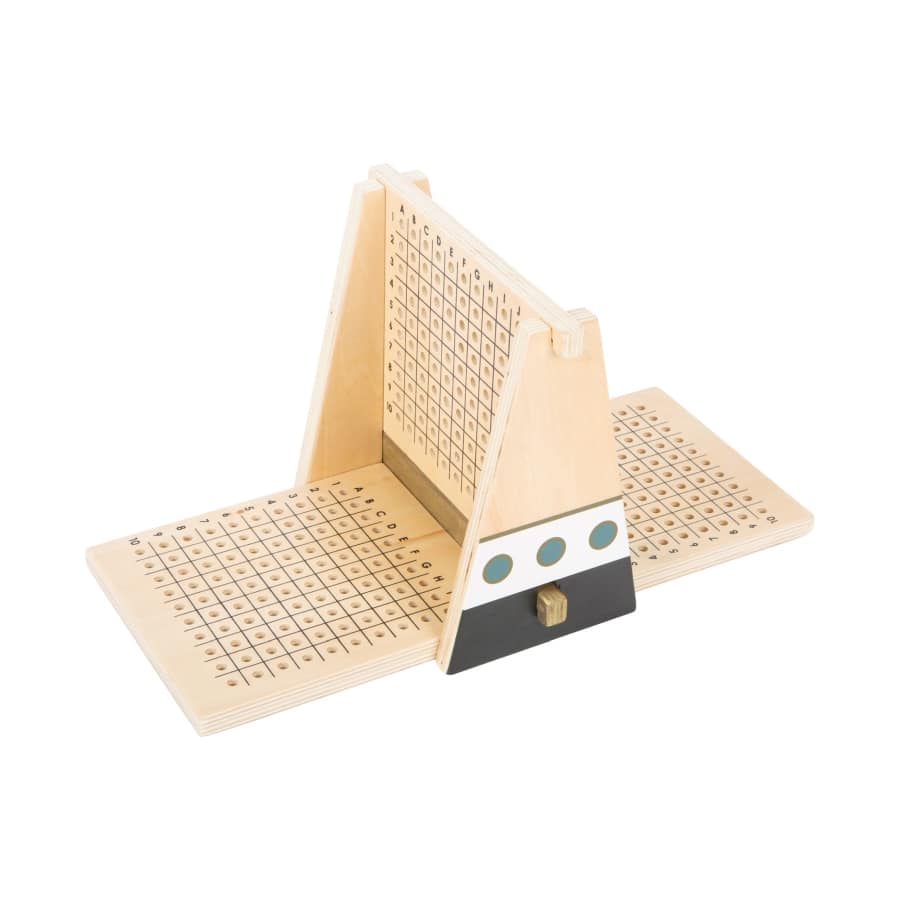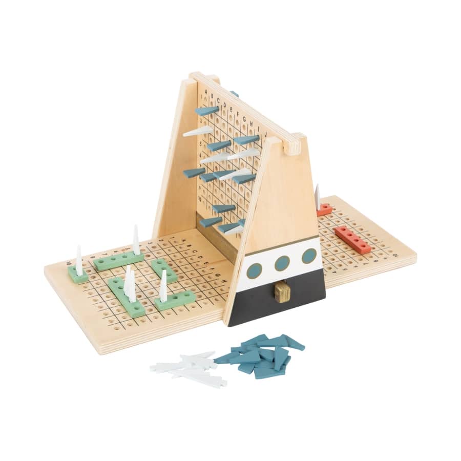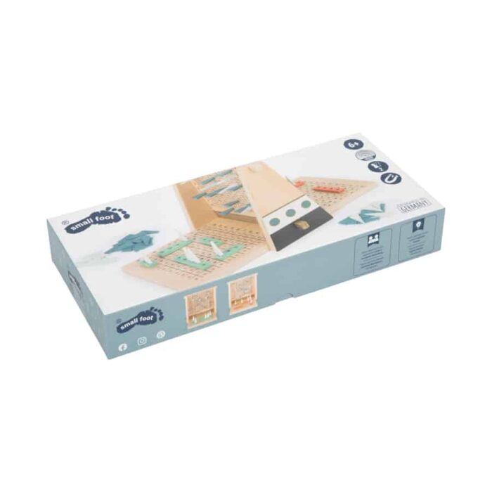 Wer findet die Flotte der Regattaschiffe? Dieses ganz aus Holz gefertigte Strategiespiel überzeugt durch außergewöhnliche, reduzierte Gestaltung mit edlen Gold-Akzenten in Kombination mit schlichtem Schwarz/Weiß, Pastellfarben und viel Naturholz. Mit seinen Regattabooten, Wasserfontänen und Segeln ist er die absolut friedfertige Interpretation des Klassikers „Schiffe versenken“! Durch im Rahmen eingelassene Magnete ist der Aufbau besonders stabil. Mit hochwertigem Spielkarton zur Aufbewahrung. Startschuss für die Regatta! Eine „dicke Nebelwand“ verhindert den Blick auf das gegnerische Starterfeld. Blaue Wasserfontänen zum Stecken zeigen während des Spiels an, wenn eine Koordinate neben einem Schiff angesagt wird, weiße Segel stehen für Koordinaten, an denen sich ein Schiff befindet. Praktisch: Die Koordinatenbrettchen können einzeln in der Hand gehalten oder in den Rahmen gelegt werden. Ein kompaktes Spiel – ideal auch für unterwegs und auf Reisen.