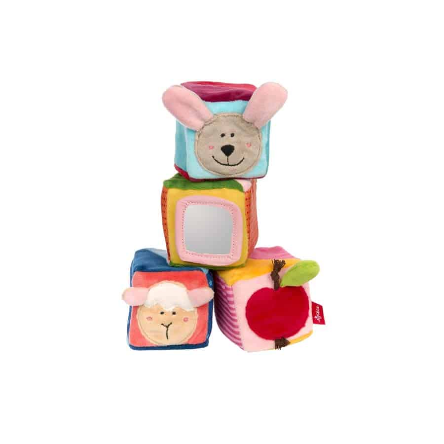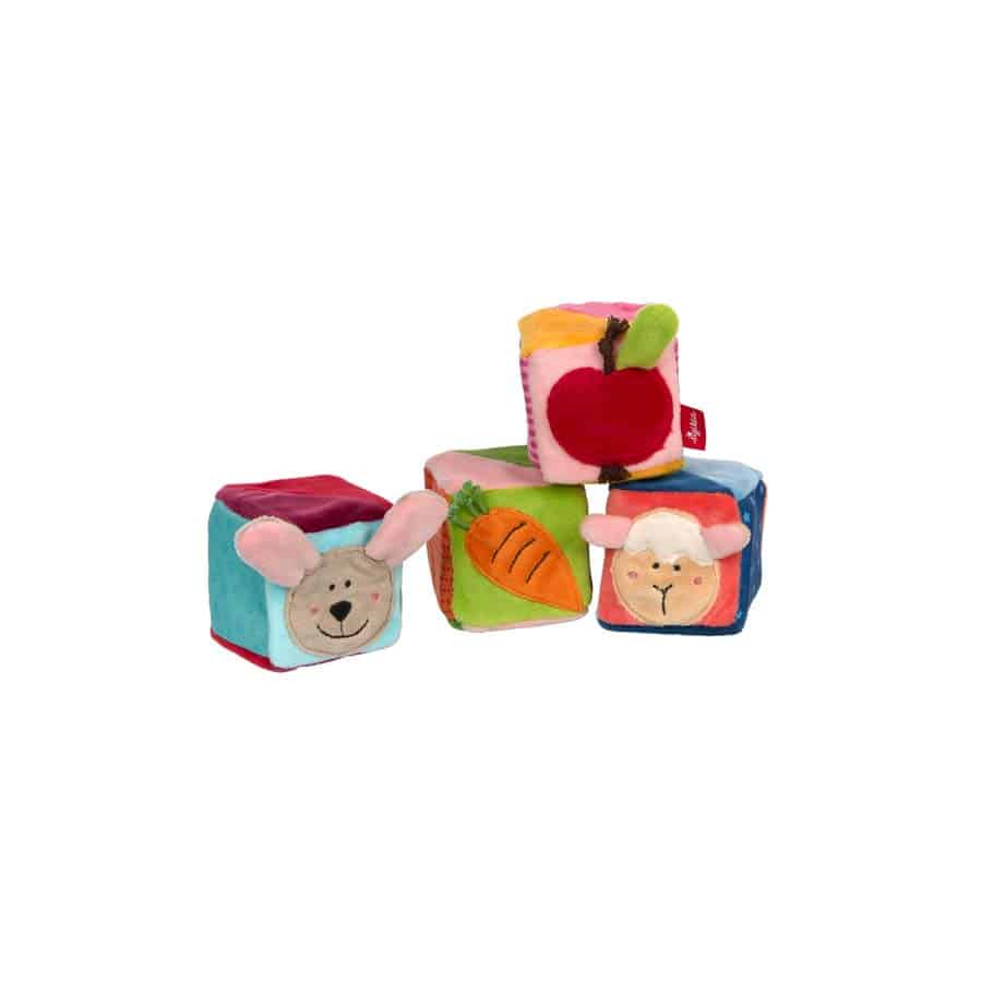Aktivspielzeug – PlayQ – spielend lernen ab dem 3. Lebensmonat. Das farbenfrohe Würfel-Set aus weichem Microplüsch und Polyesterstoffen ist ein spannendes Aktiv-Spielzeug zum Entdecken, Stapeln und kreativen Spielen für Jungs und Mädchen von 3 bis 36 Monaten. Die unterschiedlichsten Stoffe und kindgerechten Applikationen – Schäfchen, Hase, Möhre und Apfel – sind exzellent verarbeitet und bieten sowohl ein optisches wie auch haptisches Erlebnis für die Kleinsten. In jedem der vier Würfel verbirgt sich außerdem eine akustische Überraschung. Quietsche, Rassel und Knisterfolie trainieren das Gehör des Babys und belohnen erste Greifversuche. Für ordentlich Spaß sorgt außerdem der per Klett befestigte Spiegel. Hier kann sich Ihr kleiner Liebling selbst entdecken. Die kleinen Baumeister können die Soft-Bausteine stapeln und das Bauwerk anschließend mit viel Freunde umstoßen. Und wenn die Kinder die Würfel vor lauter Spielfreude einmal durch das Zimmer werfen, kann dank der weichen Füllung nichts passieren. Das Würfel-Set der sigikid PlayQ Serie fördert spielerisch die kreativen Sinne, die Feinmotorik und die Geschicklichkeit von Kindern. Alle Materialien sind hochwertig verarbeitet und halten auch häufiger Wäsche bei 30 °C in der Waschmaschine stand. sigikid legt besonderen Wert auf ausgesuchte Materialien, durchdachtes Design und Sicherheit. Durch akkreditierte Prüfinstitute finden in der Produktentwicklung und Produktion ständig Prüfungen gemäß der Spielzeugrichtlinie 2009/48/EG statt. Die Marke sigikid steht für kindgerechte Produkte, die Emotionen wecken und Eltern und Kindern gleichermaßen ein gutes Gefühl vermitteln. Seit über 50 Jahren folgt sigikid einem klaren Leitsatz: FIRST CLASS FOR KIDS! Wir machen die Welt für Familien von Anfang an kuscheliger und bunter.